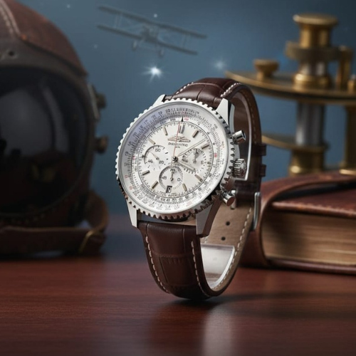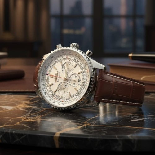Breitling Watch With a Silver Dial and Brown Leather Strap